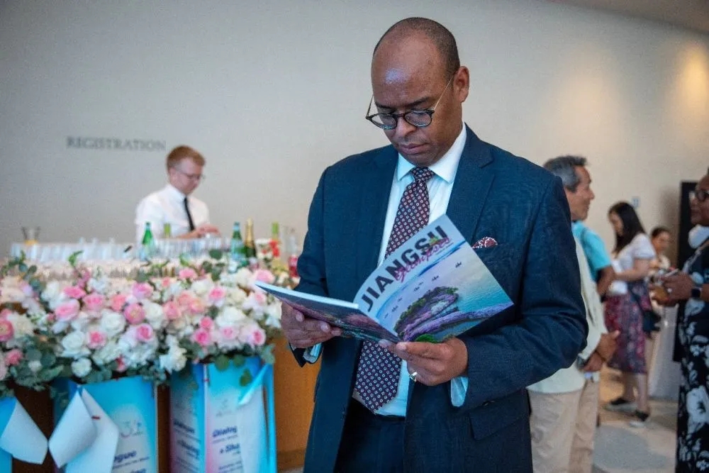 外国嘉宾在活动现场阅读《JIANGSU GLIMPSE》杂志