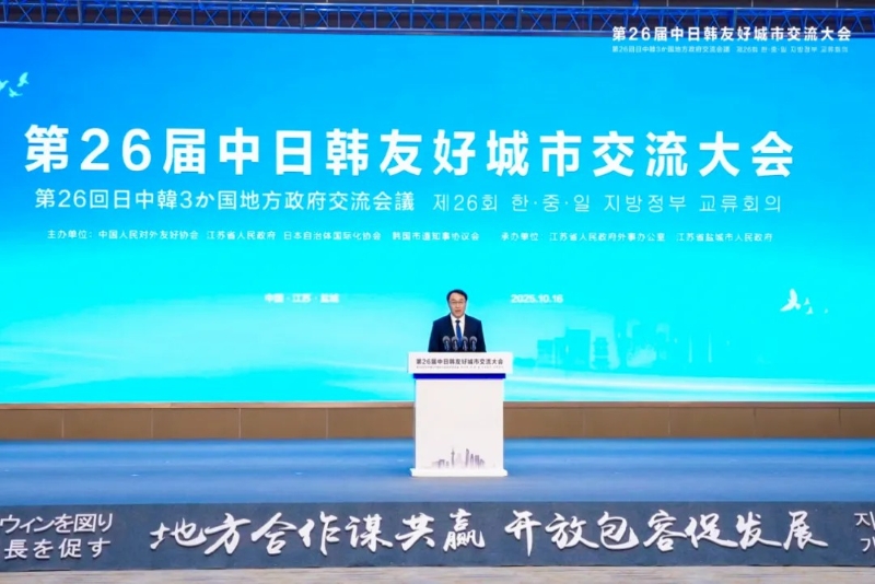 10月16日,第26届中日韩友好城市交流大会在盐城成功举办,来自中日韩三国的450名嘉宾聚焦“地方合作谋共赢 开放包容促发展”主题展开研讨,共叙友情、共商合作、共谋发展。中国人民对外友好协会会长杨万明、江苏省副省长赵岩、日本自治体国际化协会理事长安田充、韩国市道知事协议会事务总长庾敏凤、盐城市委书记周斌分别致开幕辞,盐城市市长严汉平主持开幕活动,中国人民对外友好协会副会长袁敏道、省政府副秘书长徐华勤、省外办副主任金尚军等参加。