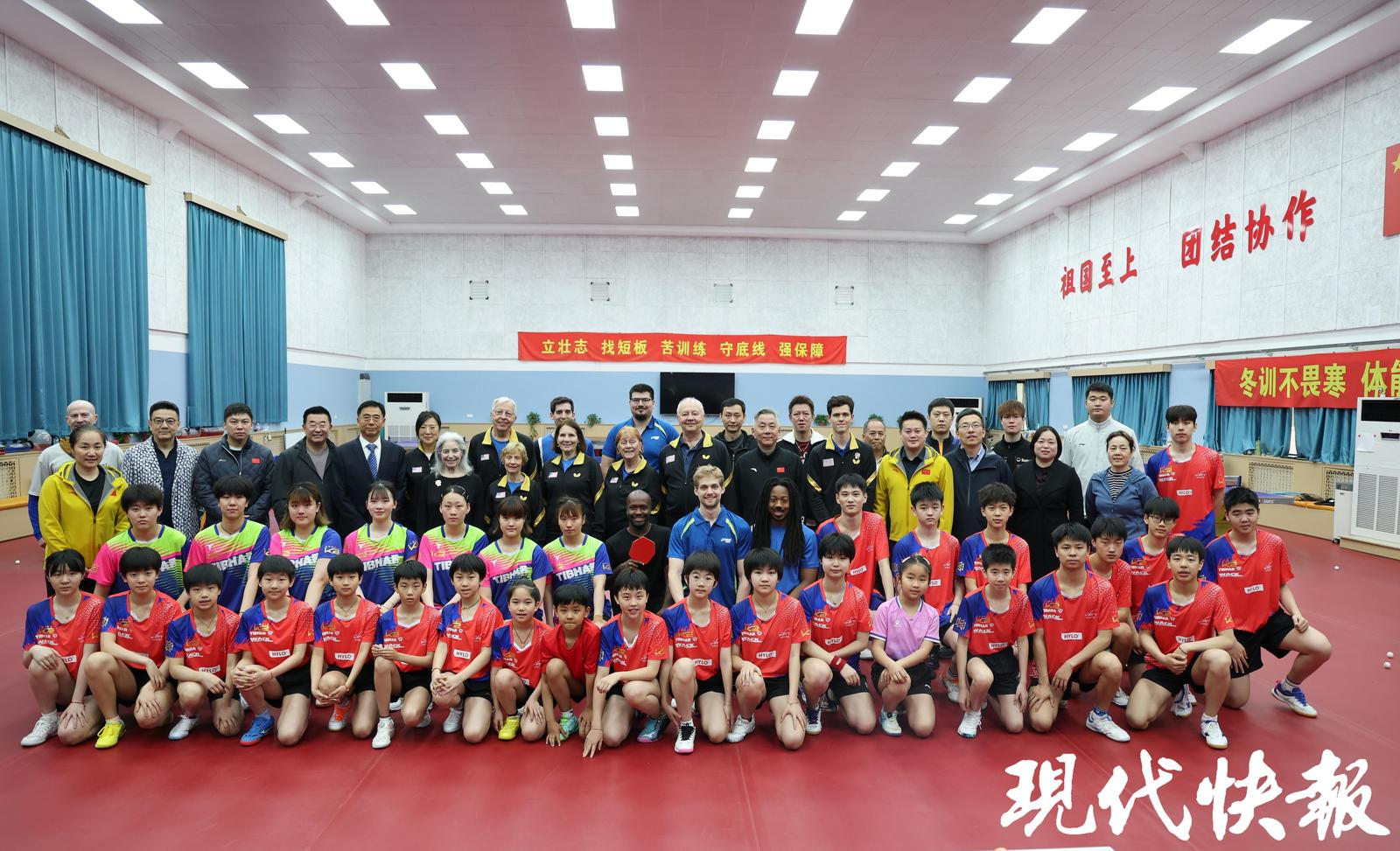 随后,代表团一行来到乒乓球馆。此时,馆内气氛热烈,正在训练的江苏青少年乒乓球运动员们用热烈的掌声欢迎了远道而来的朋友,双方旋即开启了一场别开生面的“乒乓对话”。